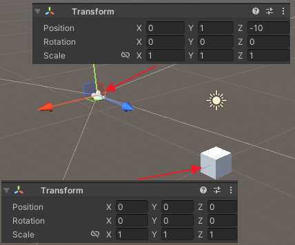 메인 카메라와 새로 생성한 Cube의 좌표를 보면 다른 것을 확인 할 수 있습니다.
