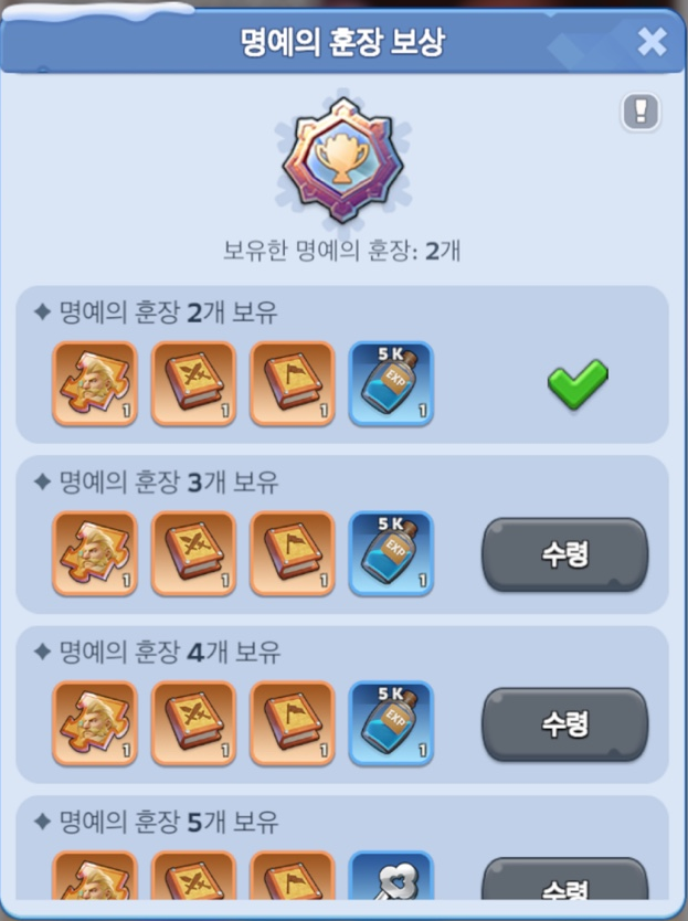 - 단계 포인트 마다 "명예의 훈장"을 지급하는데, 명예의 훈장 2~14 개까지 단계별 조각 보상이 있어, 무과금도 4단계를 채운다면 과금 영웅 조각을 모을 수 있는 구조입니다.