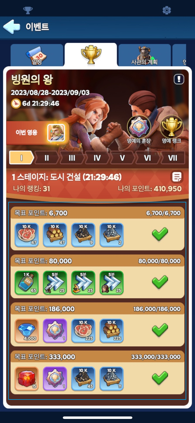 - 최강영주 이벤트의 경우 다이아를 주는 포인트까지 완료하며, 거기서 순위권 경쟁이지만, 불의수정까지 총4단계입니다.