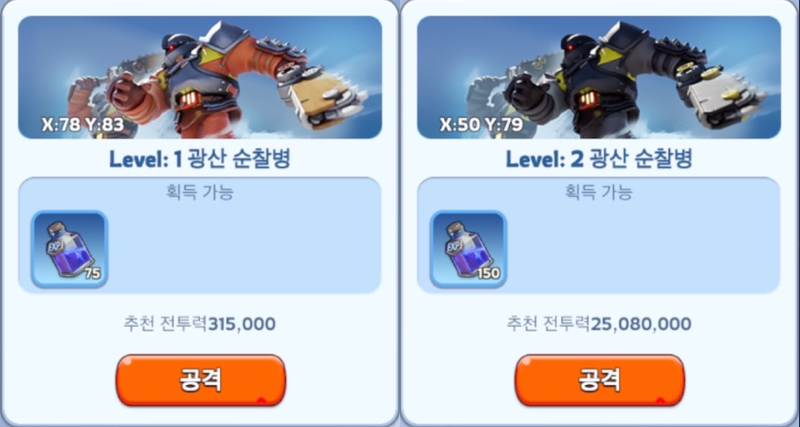 - 광맥에서 전투 패배시, 영웅은 회복시간을 가지고, 회복시간이 지나면 다시 사용 할 수 있습니다.