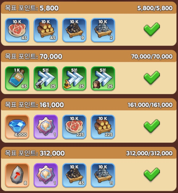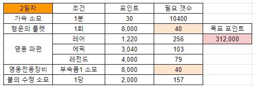 ※ 5일차 넘어서 영웅파편 소모와 영주 장비 강화로만 포인트를 쌓는 구간이 있어, 영주장비 재료 과금이 힘든 경우를 대비해서 영웅 파편 소모를 2일차에 하지 않는 것입니다.