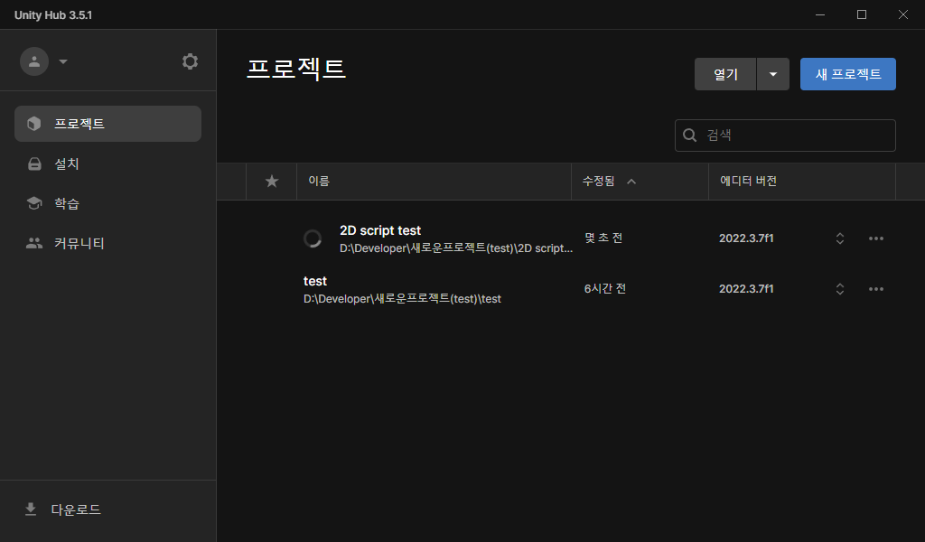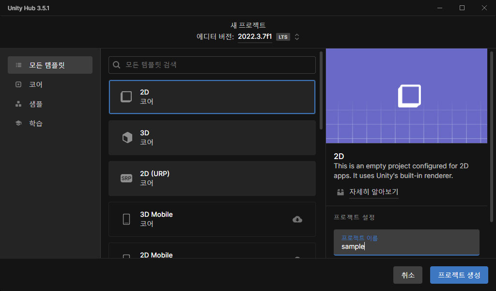 연습은 2D 기반의 게임을 만들 예정이기 때문에 새로 프로젝트를 열어줍니다.