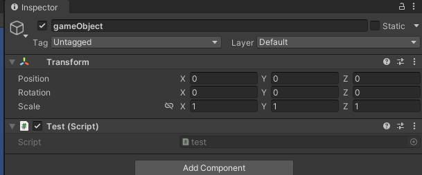 - 오브젝트의 inspector 을 보면 script가 연결됨을 확인합니다.
