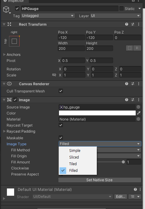 - HP 게이지를 줄이려면 UI 오브젝트의 Image에서 제공하는 Fill 기능을 사용한다.