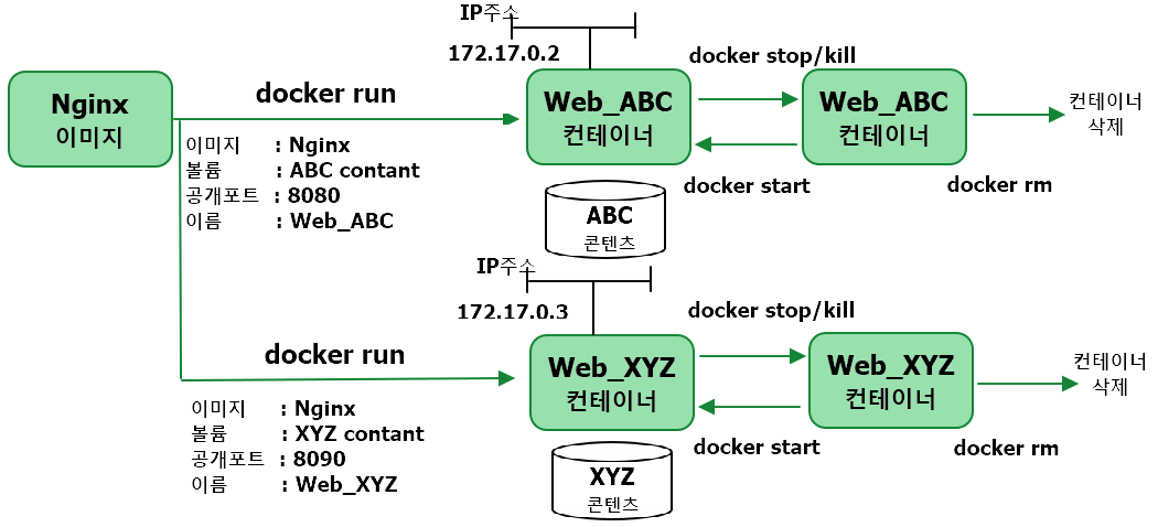 - docker start 명령어로 정지된 컨테이너를 시작하는 경우 IP주소가 할당되는데, 정지하기 이전의 IP주소는 아니다