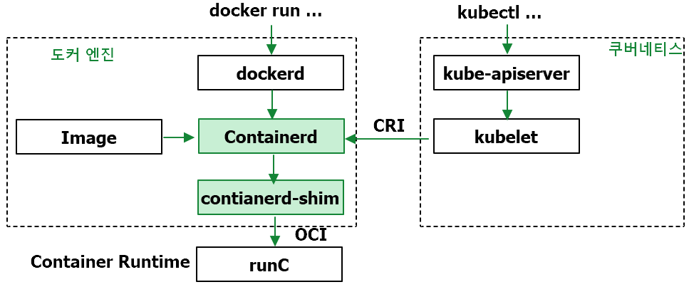 - conainerd 1.1 부터 CRI(Container Runtime Interface)에 대응하여 네이티브 kubelet 도 연동 가능