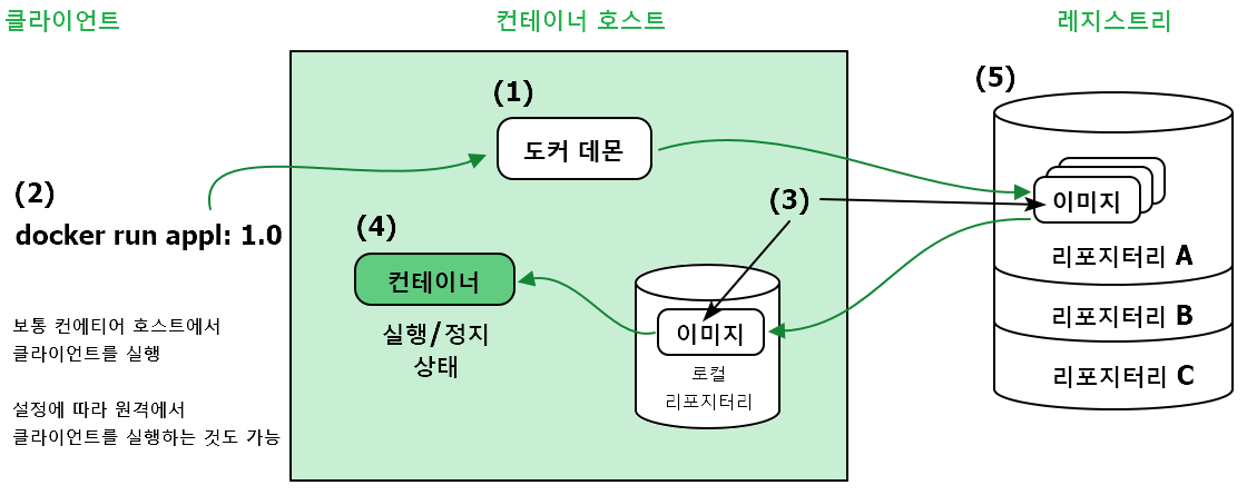 - [이미지 보관 및 전송, 컨테이너 실행, 볼륨과 같은 네트워크 연결] 컨테이너의 라이프 사이클을 호스트에서 전부 관리