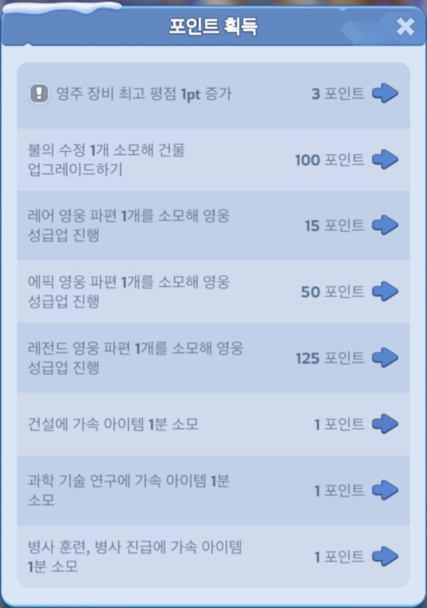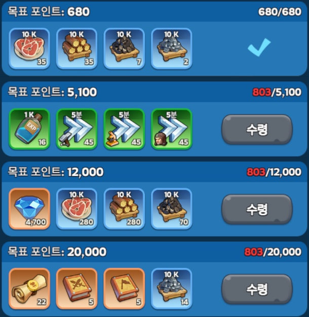 꼭 20,000포인트를 채울 필요가 전혀 없다. 필자는 무, 소과금 계정 운용시 특별한 경우가 아닌 이상 다이아를 제공하는 단계까지만 달성하거나 버린다. 포인트 획득 조건이 어렵거나, 7일짜리의 장기 이벤트의 랭킹 총 보상이 더 좋기 때문에 과감하게 버리는 경우가 많다.