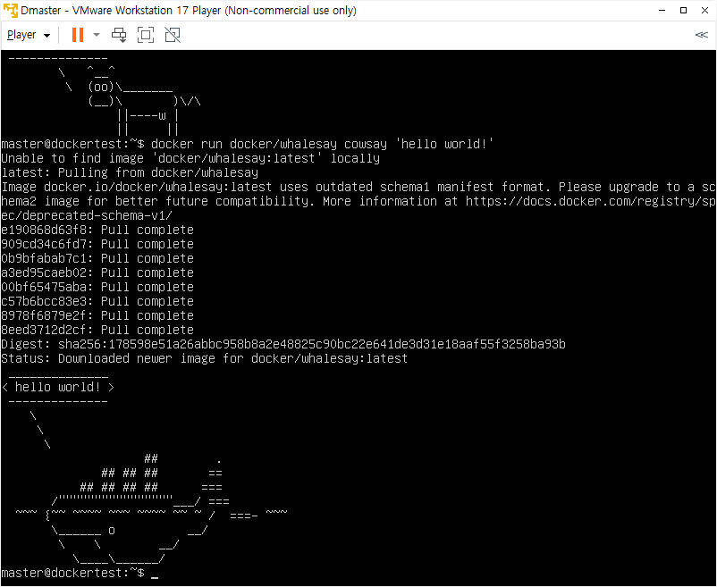 - 컨테이너를 실행하면 로컬에 docker/whalesay 라는 이미지가 없어서 자동으로 이미지를 원격 저장소에서 갖고 온다