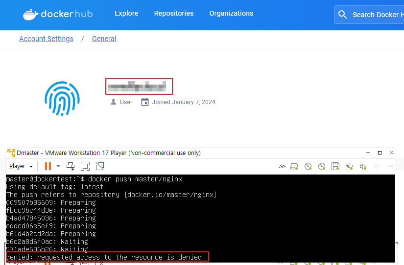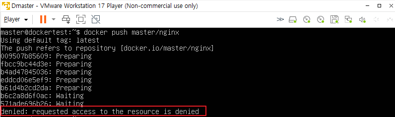 - docker push master/nginx 를 하는 경우 다음과 같은 실패 사례를 확인할 수 있다.