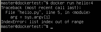 - 새로운 이미지에서는 hello.py에 들어갈 이름이 없기 때문에 다음과 같은 오류가 나온다.