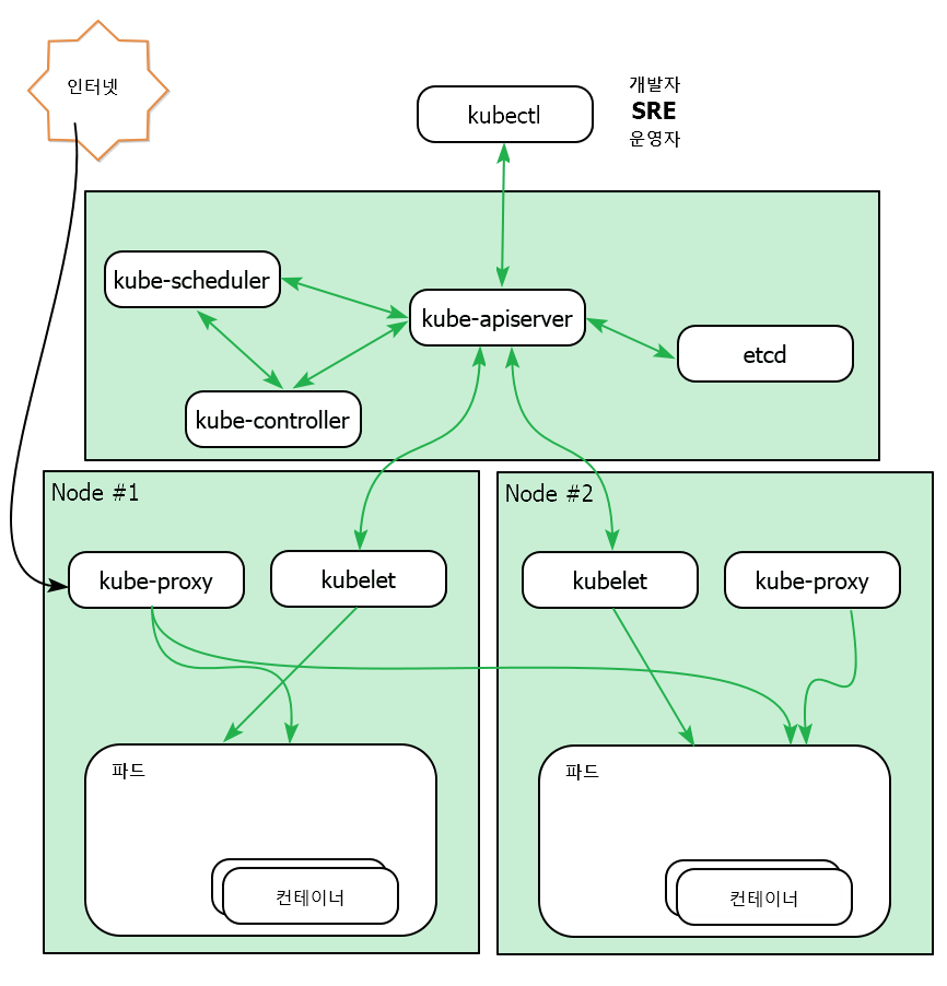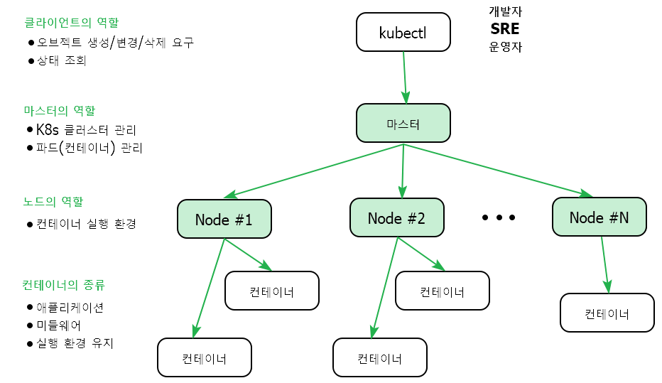 ※ 클라이언트 도구인 kubectl을 통해 K8s 클러스터를 조작하는 사람을 제일 위에 놓고, K8s 클러스터의 구성도를 그림